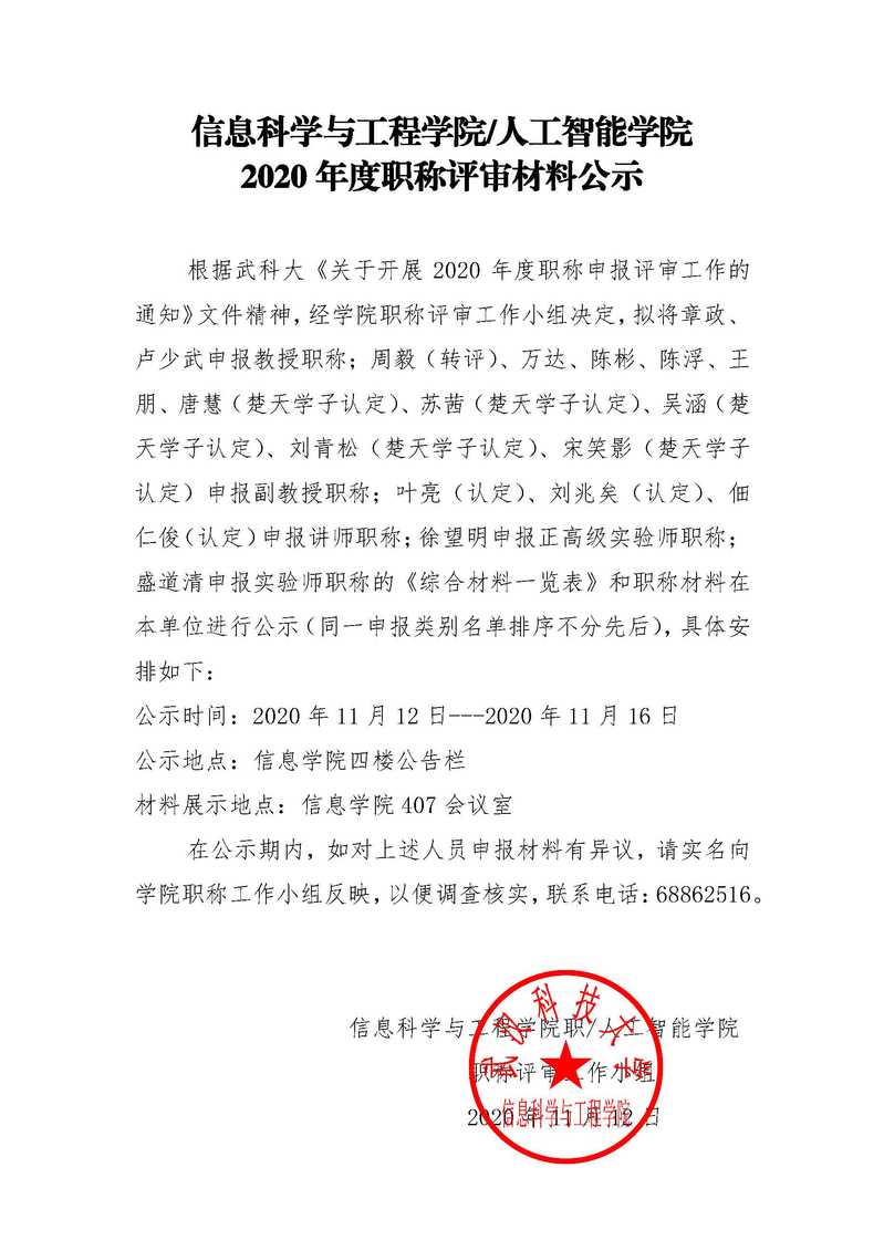 信息公司2020年度职称评审材料公示